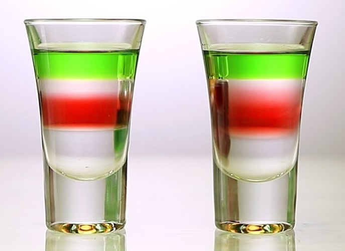 Налейте небольшую порцию охлажденного персикового шнапса в охлажденную водочную рюмку. При помощи ложки осторожно вылейте ровным слоем клюквенный сок так, чтобы он оказался сверху шнапса. Сверху добавьте порцию охлажденной водки и подавайте.